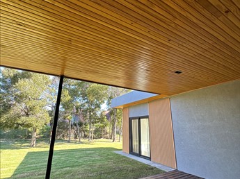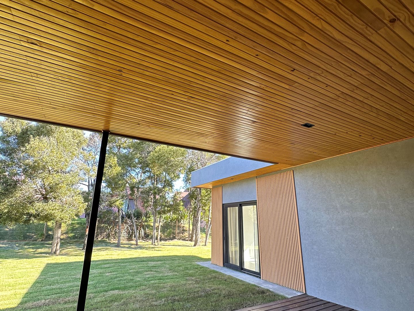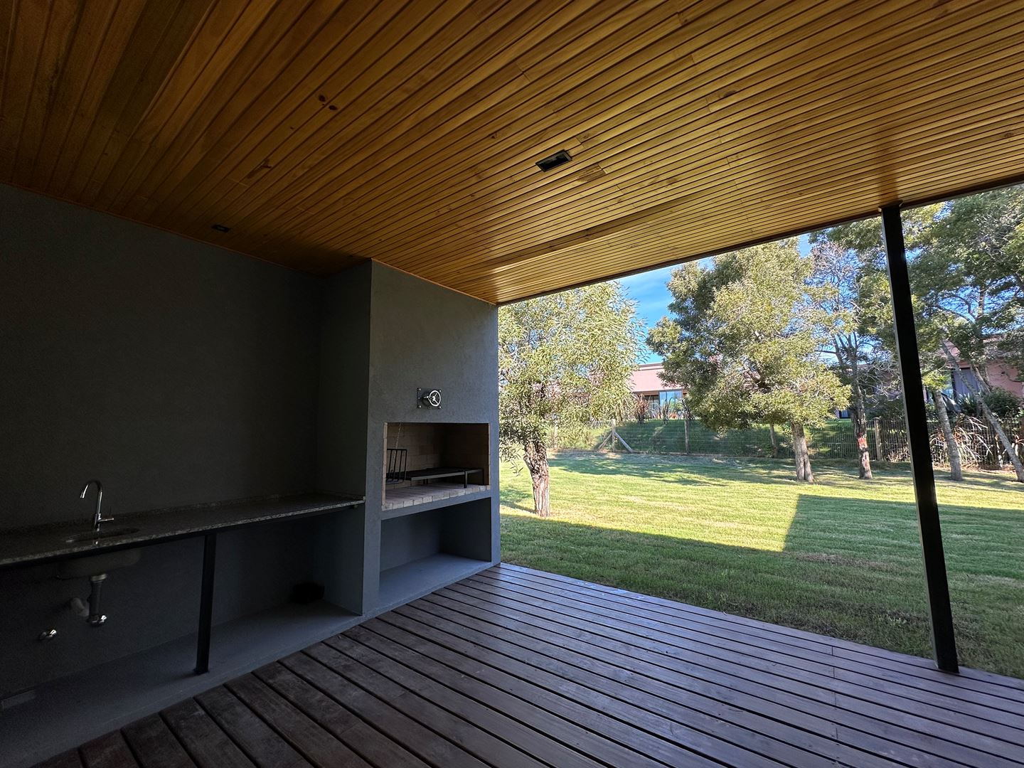 Lavadero cerrado, cochera techada para 2 autos y parrillero techado que se integra al living.